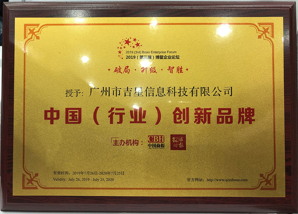 憑借著在教育行業(yè)的不斷探索深耕,廣州市吉星信息科技有限公司在本次2019(第三屆)博鰲企業(yè)論壇榮膺兩項(xiàng)大獎(jiǎng)。廣州市吉星信息科技有限公司被授予“中國(guó)(行業(yè))創(chuàng)新品牌”榮譽(yù)稱號(hào)。
