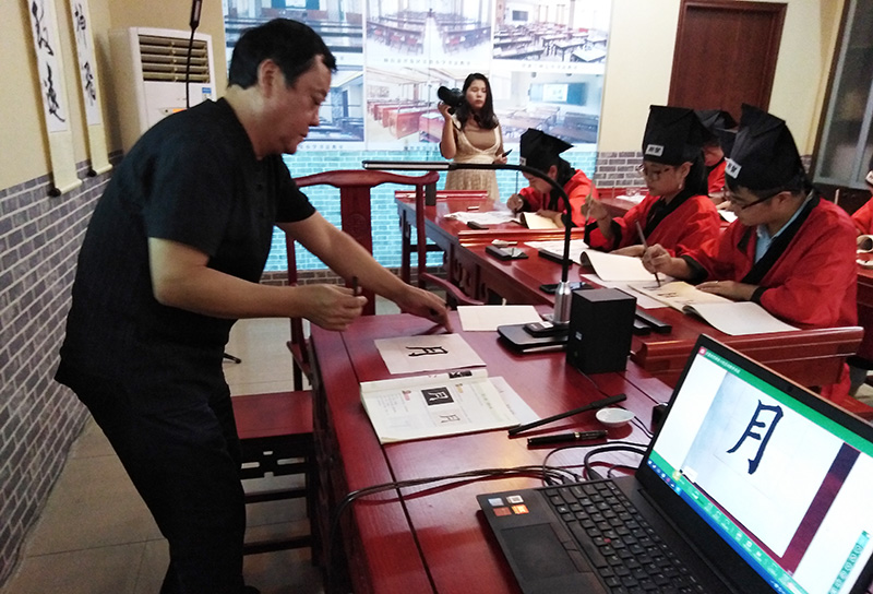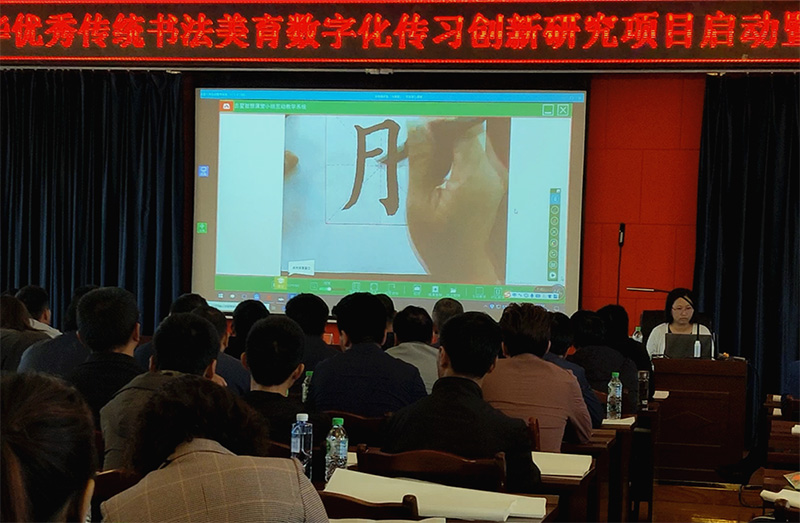 在武老師專業的書法示范教學和講解下,主課堂的學生與分會場的老師一同書寫。分會場的老師通過未來遠程書法系統,可清晰地觀看武老師和學生書寫的全過程。