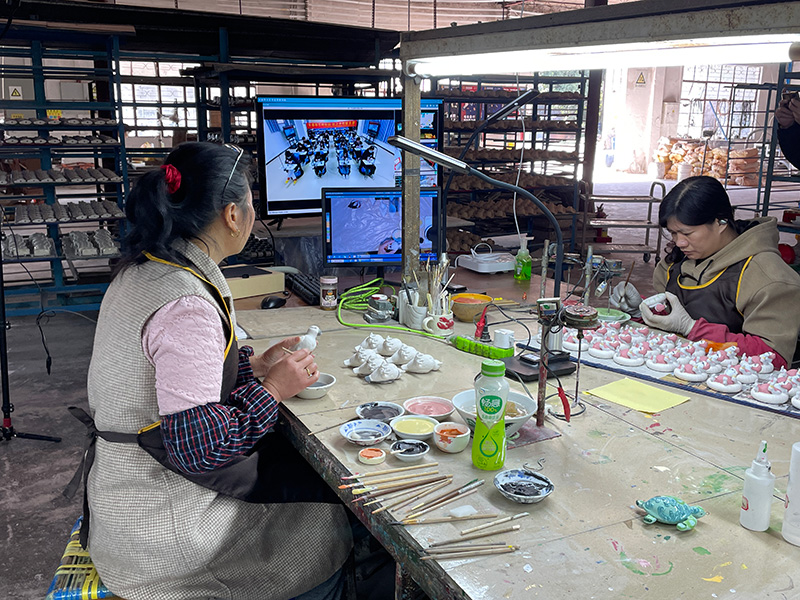 在小鎮中,非遺技藝傳承人展開了傳統技藝的教學。在陶瓷坯體上,教師耐心地勾勒著細節,不同的顏色被一點點涂抹到陶瓷上,展現出了藝術的美麗。