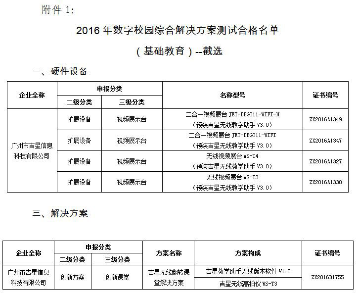 2015年12月24日,吉星無線視頻展和二合一視頻展臺等多款硬件設備和一個教學創新方案“吉星無線翻轉課堂解決方案”在眾多送測產品和方案中脫穎而出,成功通過了中央電教館2016年“數字校園綜合解決方案”檢測并將獲得證書,可參加各地區相關“數字校園解決方案”招標項目。