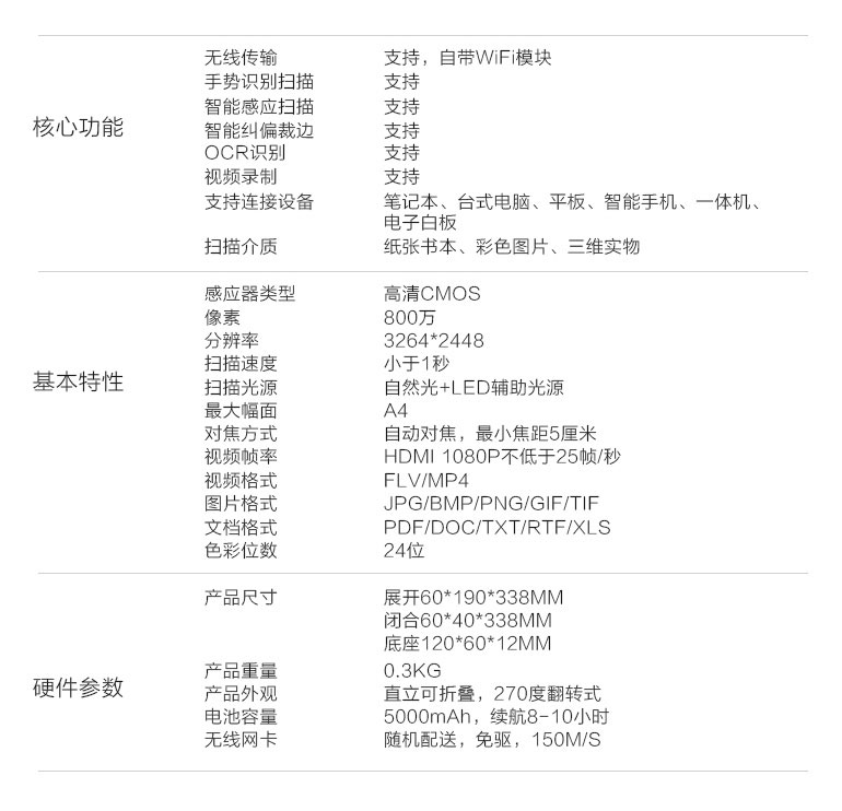 核心功能 無線傳輸、手勢識別掃描、智能感應(yīng)掃描、智能糾偏裁邊、OCR識別、視頻錄制等